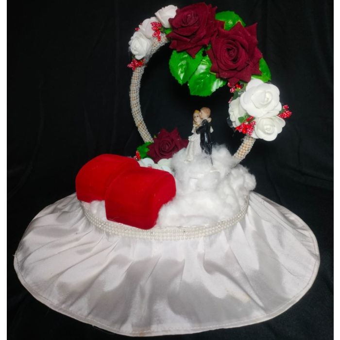 Design: Ring platter is adorned with artificial red and white roses, symbolizing love and purity, elegantly arranged around the circular frame.