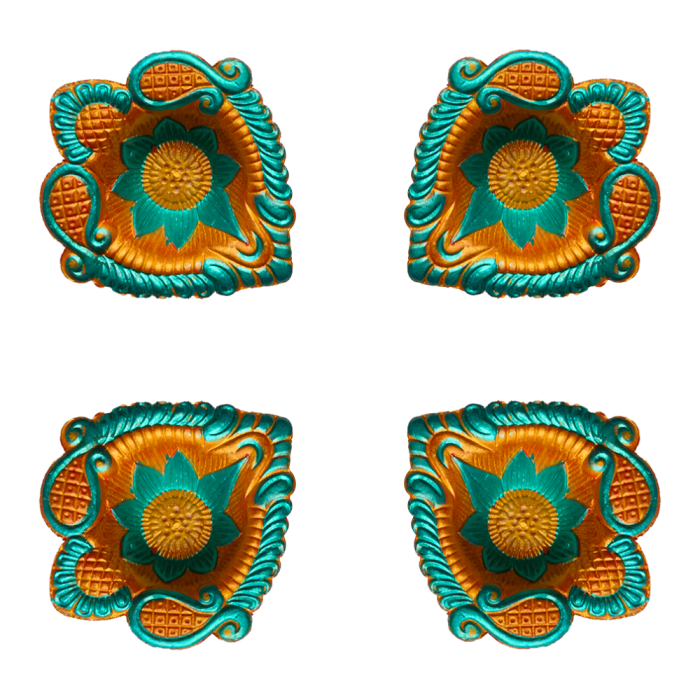 Description / Floral Decorative Clay Diya for Diwali - Turquoise Green